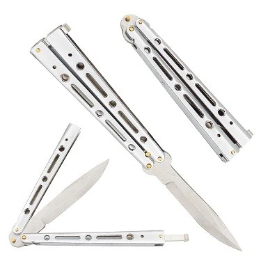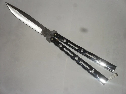 10″ Chrome Heavy Duty Butterfly Knife. 4.5 inch blade all metal construction with brass pins. 440 stainless steel with weight of 5.4 ounces