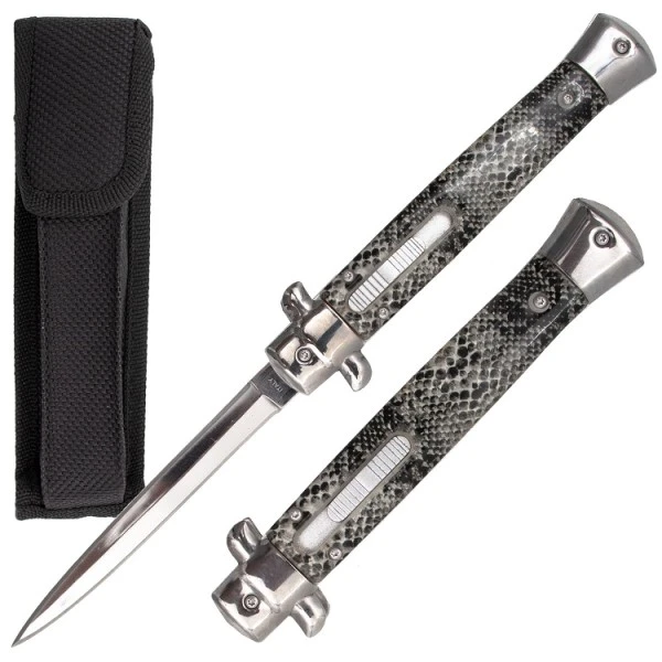 11 Inch Black Snake Double Action OTF Stiletto Automatic Knife Satin Dagger. Supreme out the front stiletto with strong double action in and out with the push of a button. Heavy construction weighing in at 8.5 ounces. 440 stainless steel 4.75 inch blade 6.25″ handle. Comes with belt sheath.