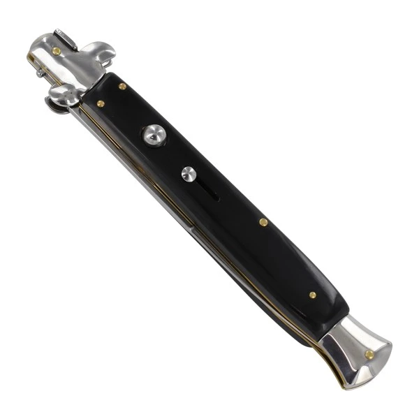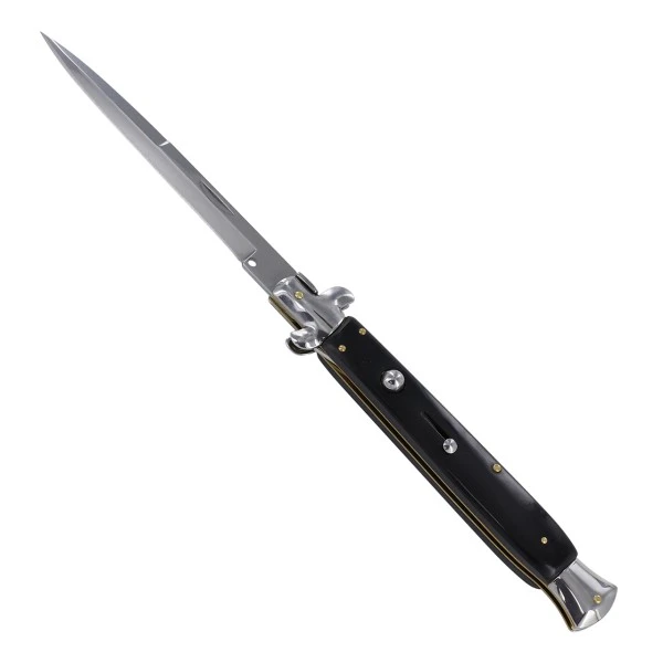 12.5″ Black Switchblade Stiletto Automatic Knife Satin Bayo. The blade is made from stainless steel and has a mirror polish finish you can almost see yourself in. To open the knife, you will press the shiny silver button on the sleek black ABS handle. To close, push on the silver t-shaped bolster above the handle on the same side as the button to open, toward the base. A slide lock on the handle prevents accidental opening while not in use. Overall Length: 12.50 Inches, Blade Length: 5.62 Inches