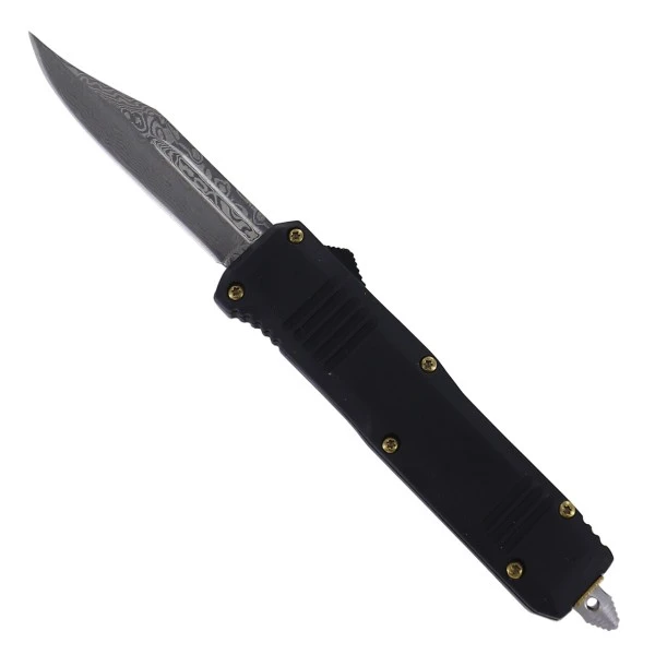 This knife is dual action, meaning when you use the button located on the side of the handle to eject the blade from the front of the handle, and you’re ready to strike. Press the button back down and the blade effortlessly goes back into the handle. The blade is forged out of 1095/15N20 Damascus steel that has been folded over and over approximately 176-180 times to give it that beautiful and unique wave-like pattern. This steel has a Rockwell rating of 54-56. The blade is formed into a clip point style which offers a quicker “stabbing” advantage with less drag during insertion and faster withdrawal. The zinc alloy handle is covered in a matte black finish, and comes with gold toned screws to keep the handle together and a gold tone pocket clip. A glass breaker is located on the bottom of the handle in case of emergency. Also included is a black nylon sheath. Overall Length: 6.75 inches, Overall Width: 1 inch