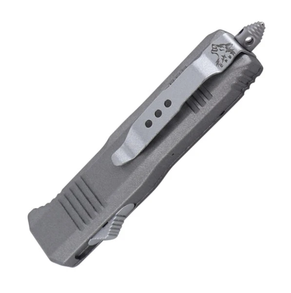 6.75″ Mini Ranger D/A OTF Grey Automatic Knife Two Tone Tanto. comes equipped with a pocket clip and glass breaker on the handle in case of emergencies. Overall Length: 6.75 inches, Blade Length: 2.75 inches. Also included is a free black nylon sheath so you can take your knife anywhere.