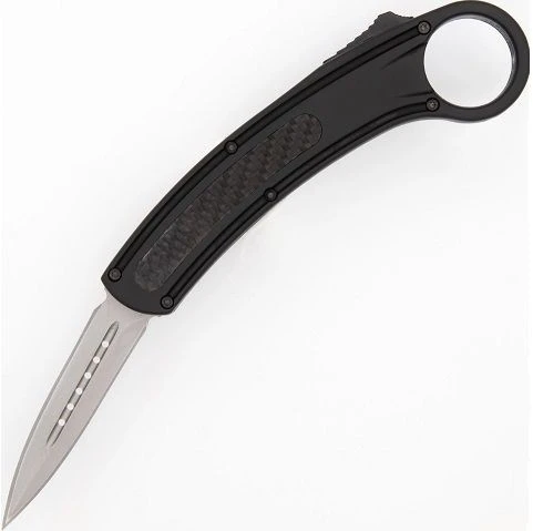 8.75″ Black Carbon Fiber Karambit D/A OTF Automatic Knife Dagger. Overall Length: 8.76 Inches Blade Length: 3.28 Inches Blade Width: 0.66 Inch Blade Thickness: 2.76 mm Blade Style: Dagger Point Blade Construction: Steel Handle Construction: Zinc Aluminum with Carbon Fiber Inlay Handle Length: 5.8 Inches Includes: Black Nylon Sheath Features: Karambit Style, Automatic Knife