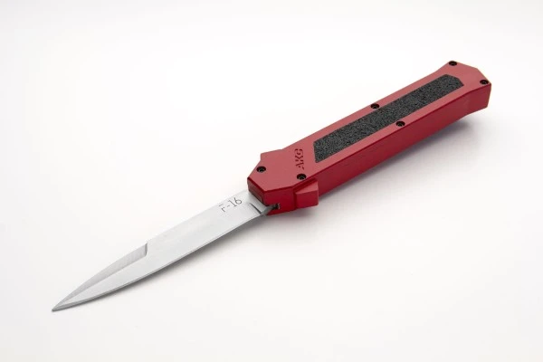 AKC F-16 Red Grip D/A OTF Automatic Knife Satin Bayo. Strong and solid mechanism with it’s double springs inside for a durable and faster opening. Blade play is almost zero minimum. Press the button forward and the blade rockets out. Pull the firing button back and the blade retracts safely. The action is fast and the knife is light and ergonomic. Satin razor sharp bayonet blade, black pocket clip. Overall Length: 20cm – 8″ Blade Length: 8.5cm – 3.35″ Blade thickness: 3mm – 0.12″ Weight: 88 g – 3.10 oz. Blade Material: 440A Stainless steel Handle Material: Aluminium Inlay Material: Black Hand Grip