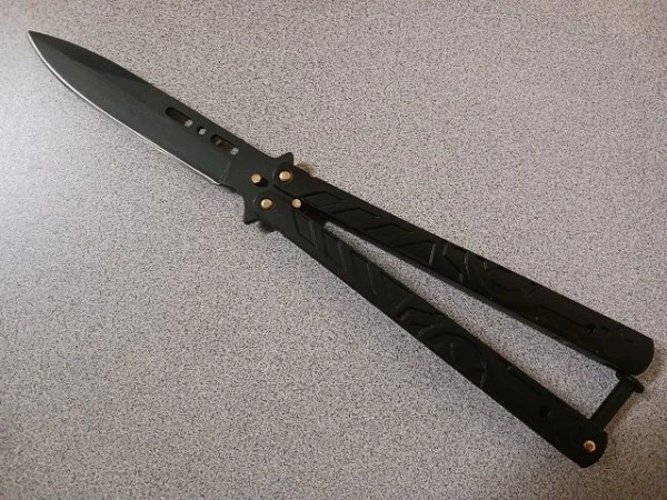 Alien Black Butterfly Knife Black Drop Point. This heavy duty butterfly knife weighs in at 5.7 oz and is put together with brass pins. Total length of 9 inches with a blade length of 3.5″. Comes with a belt sheath!