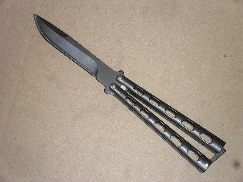 Balisong 9 Inch All Black Heavy Butterfly Knife. With a total weight of 6 ounces, this weighted flipper is ready for your pocket. Put together with stainless steel pins and all metal construction. Blade length of 4 inches stainless steel 440.