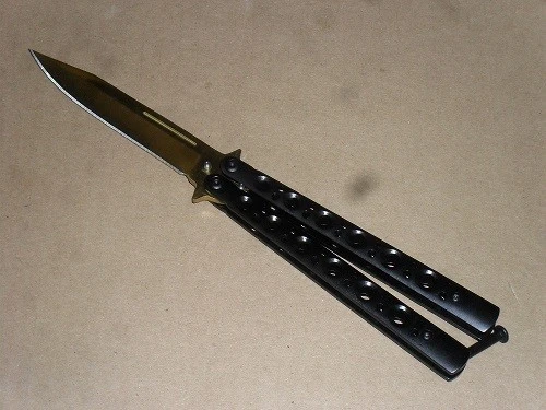 Balisong 9 Inch Heavy Folding Butterfly Knife Black Gold. 9 inches overall length black handle with a 4″ 440 stainless steel gold blade.