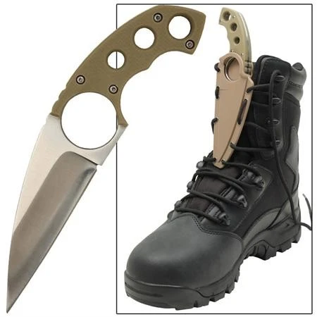 Designed to provide a quick-draw and easily accessible self-defense weapon, this full-tang neck knife is extremely durable. Featuring a razor-sharp karambit-style blade constructed from stainless steel, the handle is formed by molded ABS inserts secured by four screws. The handle inserts are textured to provide a safe and secure grip even when wet. A 14.5 inch long chain composed of steel beads is attached from the ABS sheath and can be used to suspend the knife from not only the neck but also an arm or other appendage if desired, it can also be laced through on a boot. A large ring hold on the handle can help to secure the knife in your hand when in use. Overall Length: 6.75 Inches Blade Length: 3.25 Inches Blade: Wharncliffe, Stainless Steel Blade Thickness: 2.6mm Handle: Full Tang, ABS inserts Sheath: ABS Features: 14.5 inch long Steel Chain for Neck, Nylon Cord.