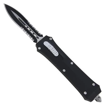 Brutal Black D/A OTF Automatic Knife Dagger Serrated. Made from 440 stainless steel. This knife has a two tone finish with a partial serration. The thumb slide is in the middle making it ambidextrous. The handle is constructed from zinc alloy with a smooth Cerakote coating. This finish prevents against abrasions and wear. It is held together with 6 powerful torc screws. A punch otherwise known as a glass breaker adorns the butt of the handle for emergencies. The steel pocket clip features the signature BA Knives Logo. Comes with a quick release nylon sheath. Overall Length: 9.44 Inches.