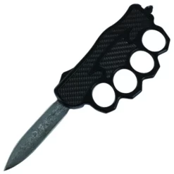 Damascus 9″ Carbon Fiber OTF Trench Knuckles Automatic Knife Dagger. The Damascus steel blade has been expertly crafted from a blend of 1095/15N20 steels that have been carefully folded together over and over to produce the lovely wave-like pattern you see here. The hefty handle is made from zinc alloy and features a sleek black finish with a carbon fiber inlay. Four large holes along the handle allow you to easily slip your fingers through for a tight grip and extra support. The handle also features a sturdy black pocket clip for easy carry, as well as a handy glass breaker in case of emergencies. If that isnβt enough to sway you, included with your purchase is a free black nylon carrying case that features a quick release opening and adjustable belt loop. Overall Length: 9 inches, Blade Length: 3.5 inches