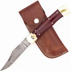 Damascus Red Wood Lever Lock Automatic Knife File Work. Overall Length: 9 Inches Blade Length: 4 Inches Blade Width: 0.75 Inch Blade Thickness: 3.02 mm Blade Style: Clip Point Blade Construction: Damascus Steel, 15N20, 1095 High Carbon Handle Construction: pakkawood, Solid Brass Handle Length: 5.05 Inches Includes: Genuine Leather Sheath file work down the spine