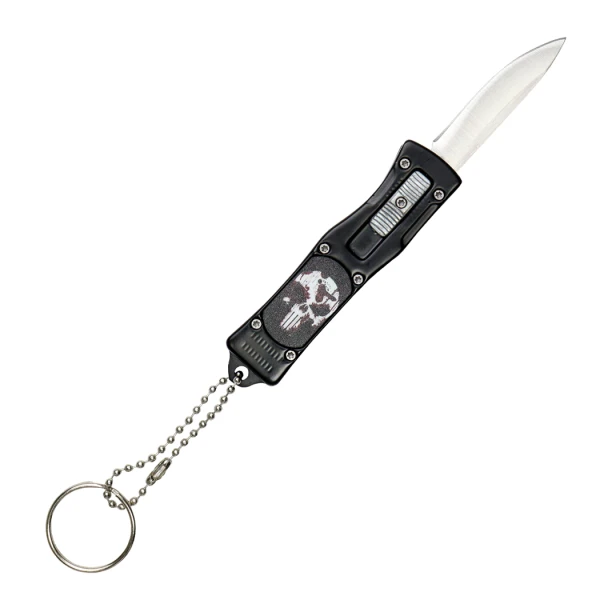 Defender Extreme 5″ Mini D/A OTF Automatic Knife Key Chain Punisher. KeyChain Knife Overall Length 5″ Blade Length 2″ Handle Length 3″ Skull Design Handle Stainless Steel Blade Keychain Ring