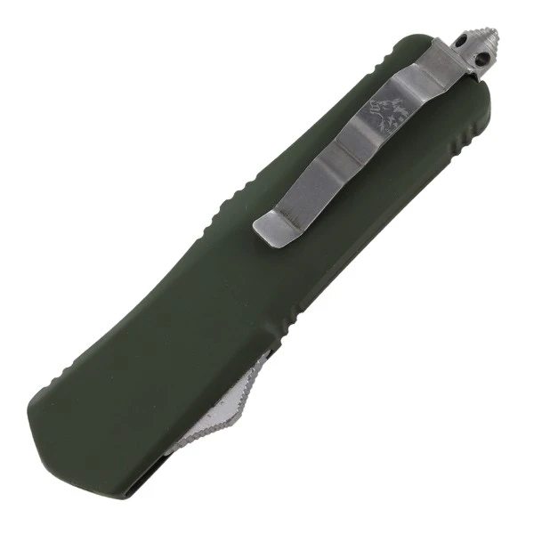 Delta Army Green D/A OTF Automatic Knife Black Dagger Double Serrated. the handle is zinc alloy steel and the blade is stainless steel. glass breaker and pocket clip. free nylon sheath Overall Length: 9 inches, Blade Length: 3.5 inches