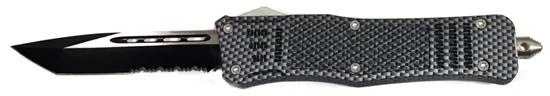 Delta Carbon Fiber D/A OTF Automatic Knife Black Tanto Serrated. Overall Length: 9 Inches Blade Length: 3.5 Inches Blade Material: 440 Stainless Steel, Powder coated finish Blade Style: Tanto Serrated Handle Length: 6 Inches Handle Material: Cast metal, Heavy duty construction Includes: Pocket Clip, Glass breaker, belt sheath