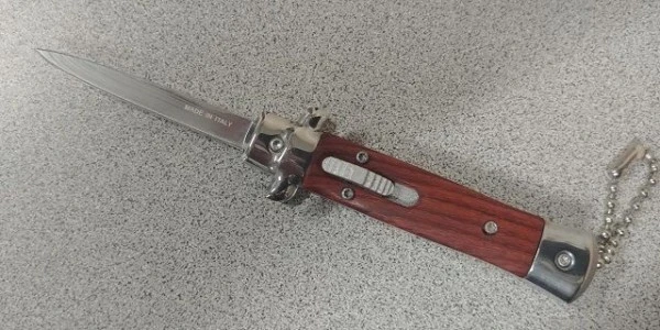 Italy Mini 4.75″ Wood D/A OTF Automatic Knife Flat Grind. 1.78″ flat blade marked made in italy. 4.75″ total length and it comes with a sheath. Excellent spring action with an easy push button.