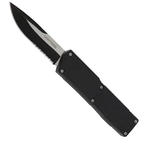 Lightning Model 3 Black D/A OTF Automatic Knife Two Tone Drop Point Serrated. Features: Heavy Duty Automatic Dual Action Out the Front Blade Material: Stainless Steel Drop Point Serrated Style Two-Toned Finish Handle Material: Zinc Alloy; Matte Black Textured Grip Silver Pocket/Belt Clip Firing Button Specifications: Overall Length: 7.85 Inches Blade Length: 3.25 Inches Handle Length: 4.55 Inches