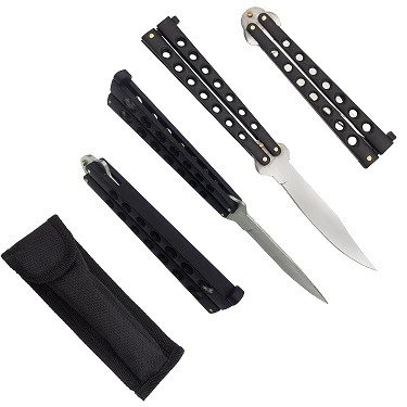 Master Flip Heavy Duty Black Butterfly Knife. 9 inch overall length 440 stainless steel 4 inch drop point blade Dual sided flip encasement Thick 0.5 inch Matte Black Design Handle Free Nylon Pouch