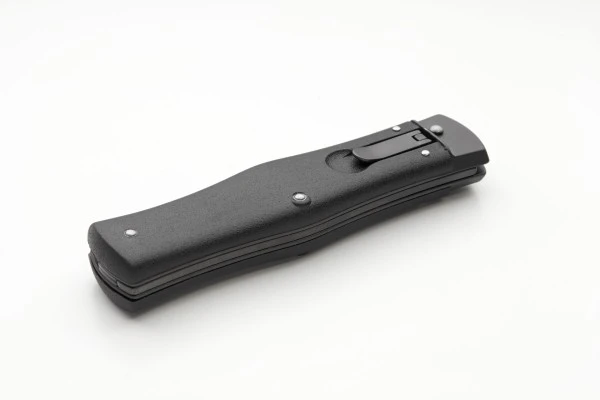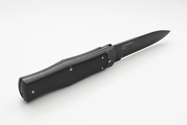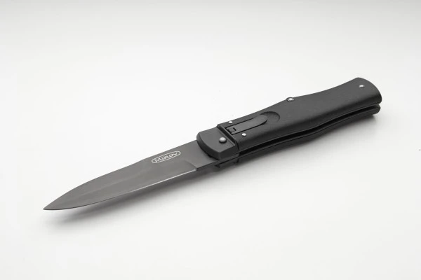 Mikov Black Switchblade Leverlock Automatic Knife Black Bayo. Overall Length: 22cm – 8.5″ Blade Length: 9,5cm – 3.75″ Blade thickness: 2,5mm – 0.1″ Weight: 130 grBlade Material: N690 Stainless steel Handle Material: ABS Black Frame Material: steel Made in: Czech Republic
