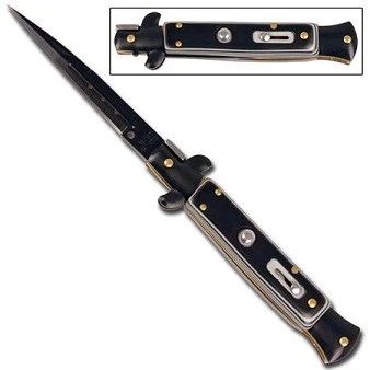 3.75 inch long Stiletto blade with well constructed ABS Charcoal handle that includes safety mechanism for security. Comes with FREE black nylon sheath and belt loop. Overall Length: 8.5 Inches Blade Length: 3.75 Inches Blade Material: Stainless Steel, Black Finish Blade Style: Bayonet Blade Thickness: 2.9mm Handle Length: 4.875 Inch Handle Material: ABS, Black and white striped finish, Brass Rivets Includes: Free Nylon Case, Belt Loop.