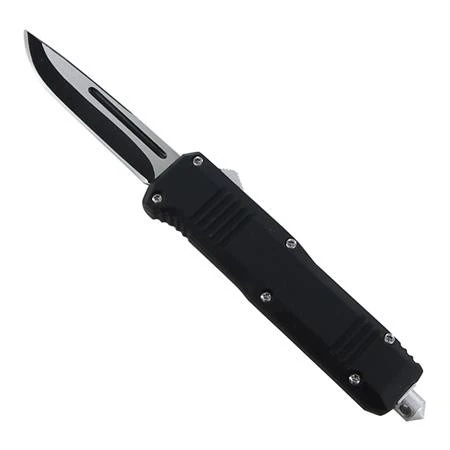Mini Scoundrel Black D/A OTF Automatic Knife Drop Point. Overall Length: 8.88 inches Blade Length: 2.88 inches Handle Length: 4 inches Features: Automatic Out the Front Blade Material: Stainless Steel Drop Point Style Two-Toned Finish Handle Material: Zinc Alloy Matte Black Finish Glass Breaker Nylon Sheath Included.
