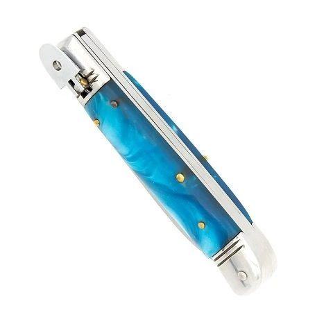 Ocean Pearl Blue Lever Lock Automatic Knife Stainless. faux marble ABS grips, comes with its own black nylon sheath with a belt loop. Overall Length: 8 inches (Open), 4.5 inches (Closed). Weight: 0.4 lbs