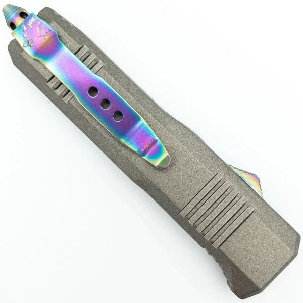 Ranger 6.75″ D/A OTF Silver Automatic Knife Damascus Titanium Serrated Dagger. Silver zinc alloy handle. It has a dual action mechanism, titanium switch on the side. The blade is made of stainless steel in a two-tone titanium damascus finish. The blade is formed in a spear point style, and is also partially serrated on both sides of the blade. A glass breaker located on the bottom of the handle. Comes with a nylon carrying pouch 1095/15N20 steel Overall Length: 6.75 inches Blade Length: 2.75 inches Handle Length (Glass breaker Included): 4 inches