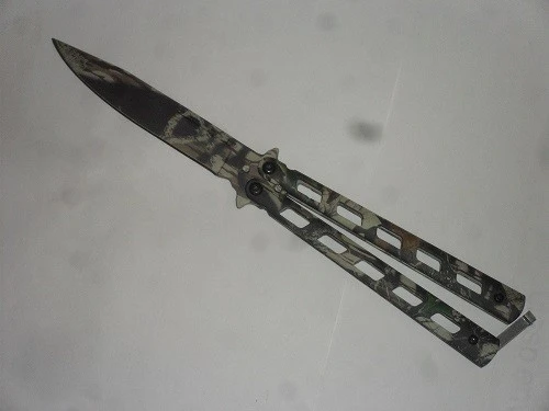 Real Tree Camo Heavy Butterfly Knife. 9″ total length and 4 inch 440 stainless steel blade. All metal handle!