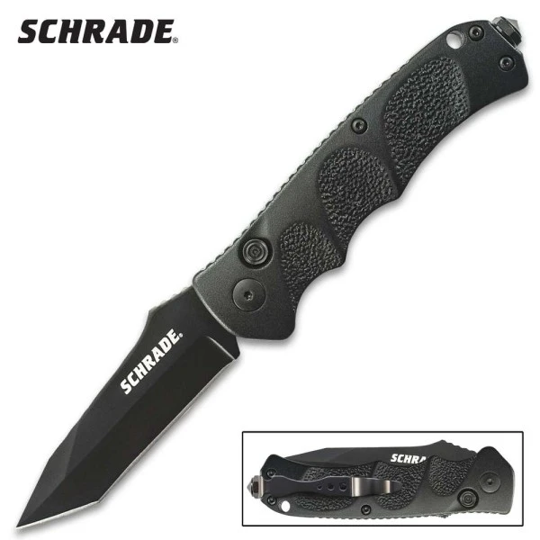Schrade Extreme Black Button Lock Knife Black Tanto. This pocket knife is a button lock knife that features It has a black 3 1/4β, hollow ground, 4116 stainless steel tanto blade, The handle is black-coated aluminum with ergonomic, scalloped finger grooves and has a large diameter glass-breaker tip. it has a tip-up carry pocket clip and itβs 7 4/5β in overall length