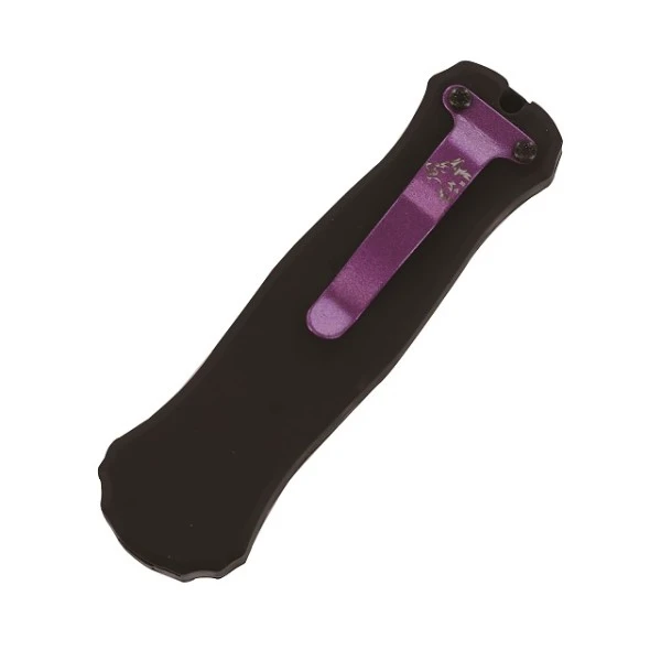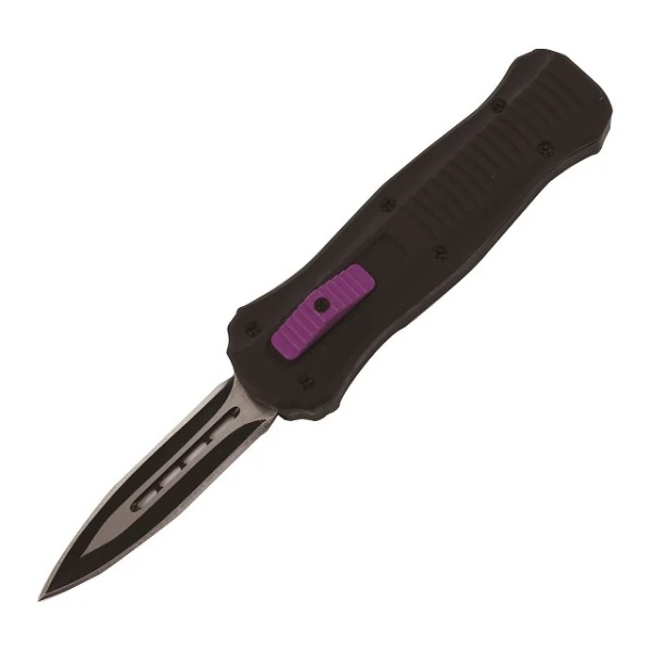 Short Black Purple D/A OTF Automatic Knife Dagger 5.5″. The stainless-steel blade has a sharp double edge and a dagger point tip. A two-toned finish on the blade adds appeal while offering scratch resistance. The curvy handle is made from zinc alloy and has a textured finish for a firmer grip. A bright purple slider is centered in the middle making this dual action blade ambidextrous. The purple pocket clip on the back of the handle provides easy carry. This knife is perfect for every day carry due to its conveniently small stature. Included with your knife is a complementary black nylon sheath with belt loop and quick release. Overall Length: 5.5 inches, Blade Length: 2.125 inches