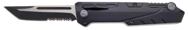 Slim Side Release Black D/A OTF Automatic Knife Tanto Serrated. Blade Material 440 Stainless Steel Blade Type Serrated Folding Action Out the Front Handle Construction Stainless Steel Features Belt Clip, and Nylon Carrying Case Blade Length 3.75″ Handle Length 5.75″ Overall Length 9.5″