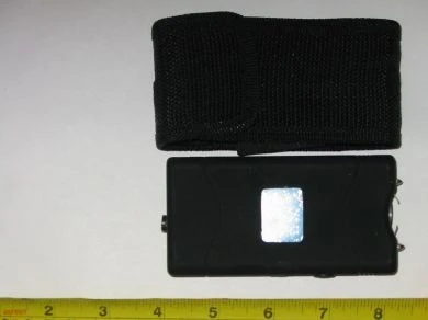 stun gun striker 2500kv as006 rubber like grip around the stun gun these have super loud snap to them and a flashlight with a plug built in for the wall to recharge. 4 inches total length with the sheath