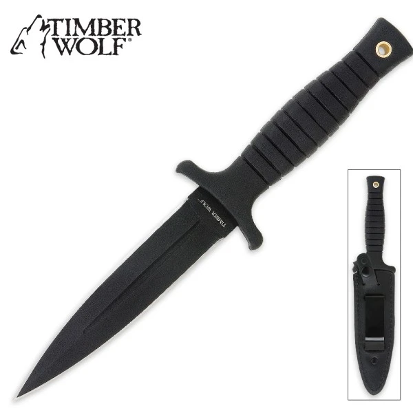 Timber Wolf Boot Knife Belt Clip Leather Sheath. 5″ double edged stainless steel blade Rubberized handle with guard Brass lanyard hole Includes clip-on boot sheath Overall length: 9″