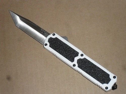 Titan White D/A OTF Automatic Knife Satin Tanto. 440 stainless steel 3.25″ blade with a pocket clip on the side of the handle. 8″ overall length. Strong spring action with a push of the button you can hear the blade snap into position. A glass breaker is attached on the end. This knife is made in taiwan.