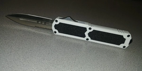 Titan White Grip D/A OTF Automatic Knife Satin Dagger Serrated. comes with a pocket clip, glass breaker on the end of the handle and scruffy inserts for better grip. On the spine there is a push button for the OTF blade action. Very sturdy knife with great spring action and a hard snap to it. The overall length is 8.5″ with a silver double sided blade length of 3.25″.
