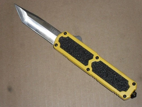 Titan yellow D/A OTF automatic knife satin tanto plain. 440 stainless steel 3.25 inch blade with a pocket clip on the side of the handle. 8.5 inches overall length. Strong spring action with a push of the button you can hear the blade snap into position. It has a glass breaker on the end of the handle. The handle has scruffy grip inserts and the push button is on the spine. The blade pops in and out with a flick of the button. This knife was made in taiwan.